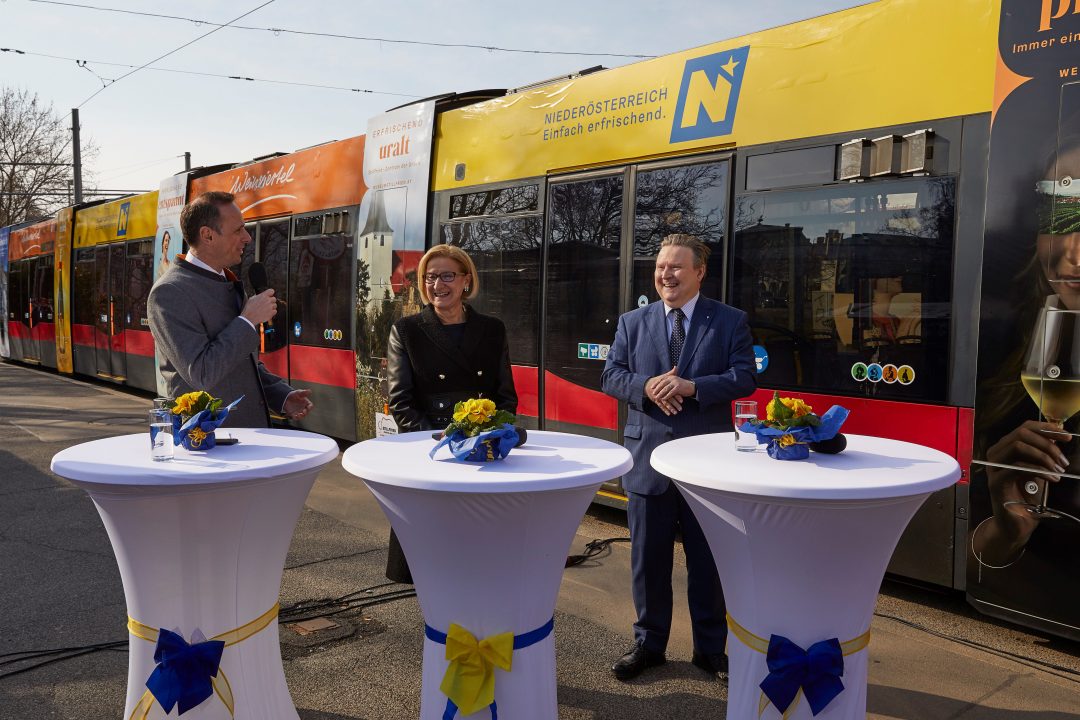 Die drei Straßenbahn-Garnituren im Weinviertel-Design wurden am 14. März am Karlsplatz in Wien präsentiert. Niederösterreichs Landeshauptfrau Johanna Mikl-Leitner, Wiens Bürgermeister Michael Ludwig und Niederösterreichs Tourismuslandesrat Jochen Danninger ließen es sich nicht nehmen, bei der „Jungfernfahrt“ dabei zu sein. Duch die Aktion soll das Wiener Publikum auf das Weinviertel als Ausflugs- und Urlaubsregion vor den Toren Wiens aufmerksam gemacht werden. Auf den gebrandeten Straßenbahnen, die durch Wien touren, finden sich 36 Sujets von lokalen Betrieben und touristischen Partnern wie Ausflugsziele, exklusive Weingüter, Beherbergungsbetriebe, regionale Produzenten und idyllische Kleinregionen.