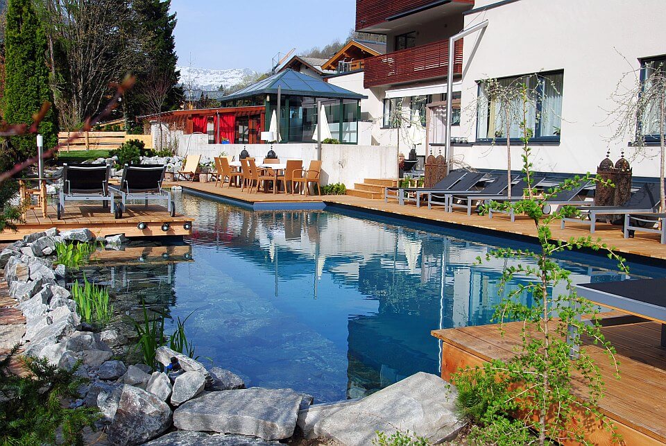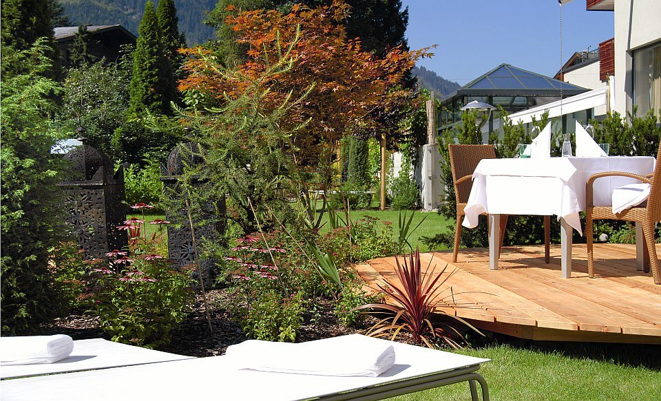 Ganz neu sind das Skydeck, ein Panoramaspa auf der Dachterrasse mit Altholzsauna, Ruhelounge und Panoramablick über ganz Hinterglemm sowie der Naturbadeteich. Die Gartenoase lädt zum meditieren und entspannen ein.