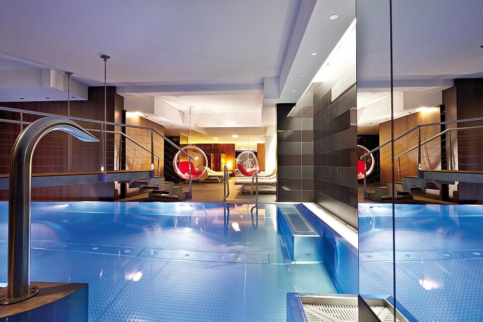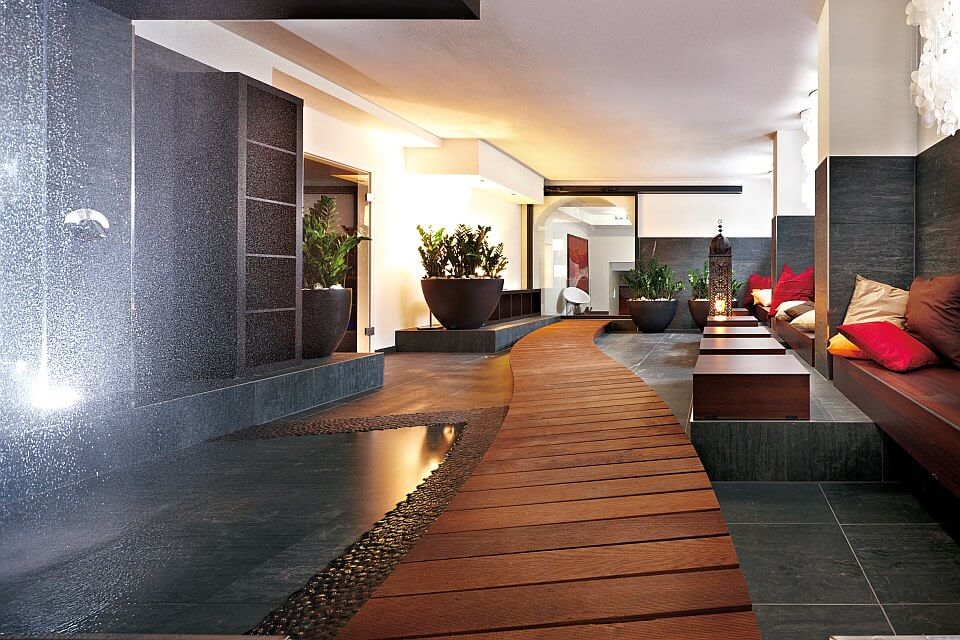 Zum orientalischen Flair gehört natürlich das Wellness-Angebot, in diesem Fall der traumhafte Amber Spa mit 1.500 m² auf drei Etagen. Im Sinne der namensgebenden alten orientalischen Herbergen sind es Orte der Ruhe und exotischer Mystik. Trotzdem bleiben keine Wünsche offen, so werden alleine über 50 Anwendungen wie Yoga und Meditation, Qigong, Tai-Chi, Sufi-Trance, Massage, Kundalini, Ku Nye, Body Balm, ila Chakra Wellbeing, Pregnancy Treatment sowie klassische Massage oder Chakra-Behandlungen geboten. Wasserflächen überall – Hallenschwimmbad samt Wasserfall, Massageliegen und Regendusche, ein beheizter Outdoorpool mit Blick auf das Bergpanorama. Die Saunawelt lässt mit ihren acht Saunen, darunter Hamam und Zirbensauna, keine Wünsche offen.