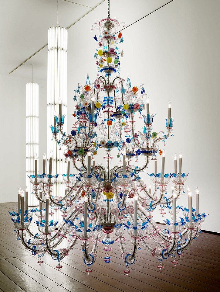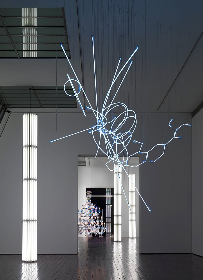 Im Zusammenspiel diesem Werk entsteht ein einzigartiges Arsenal des künstlerischen Oeuvres und als solches Wegweiser zu vielfältigen Fragen und Entwürfen. ‚Sprechende‘ Kronleuchter aus Murano-Glas, Morsecode emittierende Apparaturen oder raumhohe Säulen aus strahlenden Neonröhren.