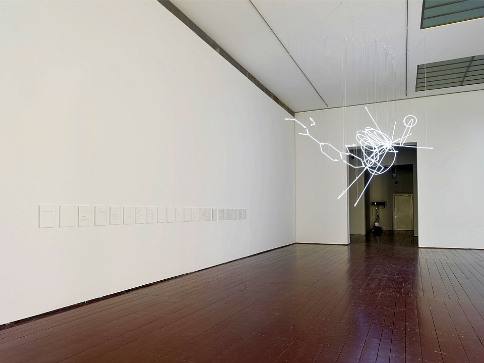 Im Mittelpunkt steht die eigens für die Ausstellung im TBA21 geschaffene Neonarbeit „A Community Predicated on the Basic Fact Nothing Really Matters“ (2013). Von der Decke hängend vereint sie die wilden Trajektorien der Atome des Higgs-Boson vom 4. Juli 2012 im CERN-Teilchenbeschleuniger mit der chemischen Formel, die Albert Hofman 1938 zur Herstellung von LSD entwickelte.